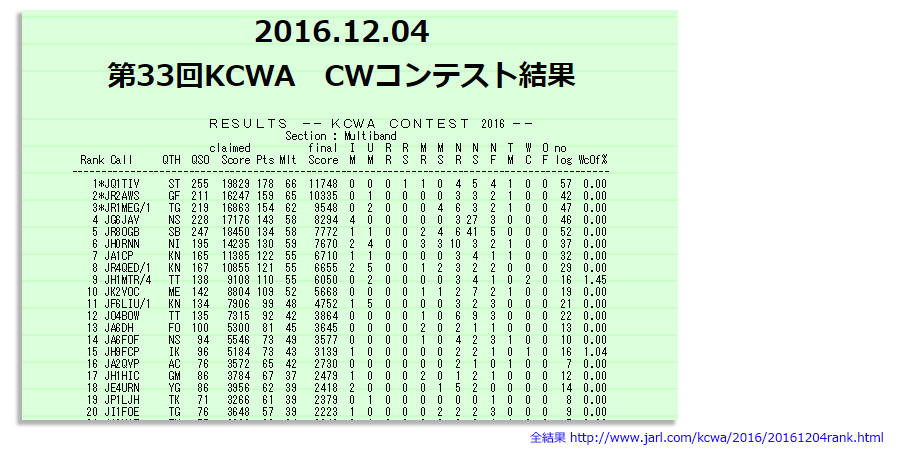 2016年12月4日開催されたKCWA CWコンテストの結果が発表されていた。弊局JG6JAVはマルチバンド部門で4位という成績でした。かなり減点されてしまってます。相手のコールサインコピーミスは判るにしても相手がこちらが送信したナンバーをミスコピーというのが目立ちます。困ったさんです。三桁数字のゼロサプレス(007だったら7)送信とかØを略符号Tで送信するとか国内局に少ない送信の仕方をしていたせいだったのかも。送信は自動送信なので手打ちみたいなバラツキはなかっと思う。そんなに速度も上げてない。いろいろ言っても問題は自分に有りです。コンテスト当時の運用状況は『2016-12-04:KCWAコンテストに参加してました。』を参照されたい。