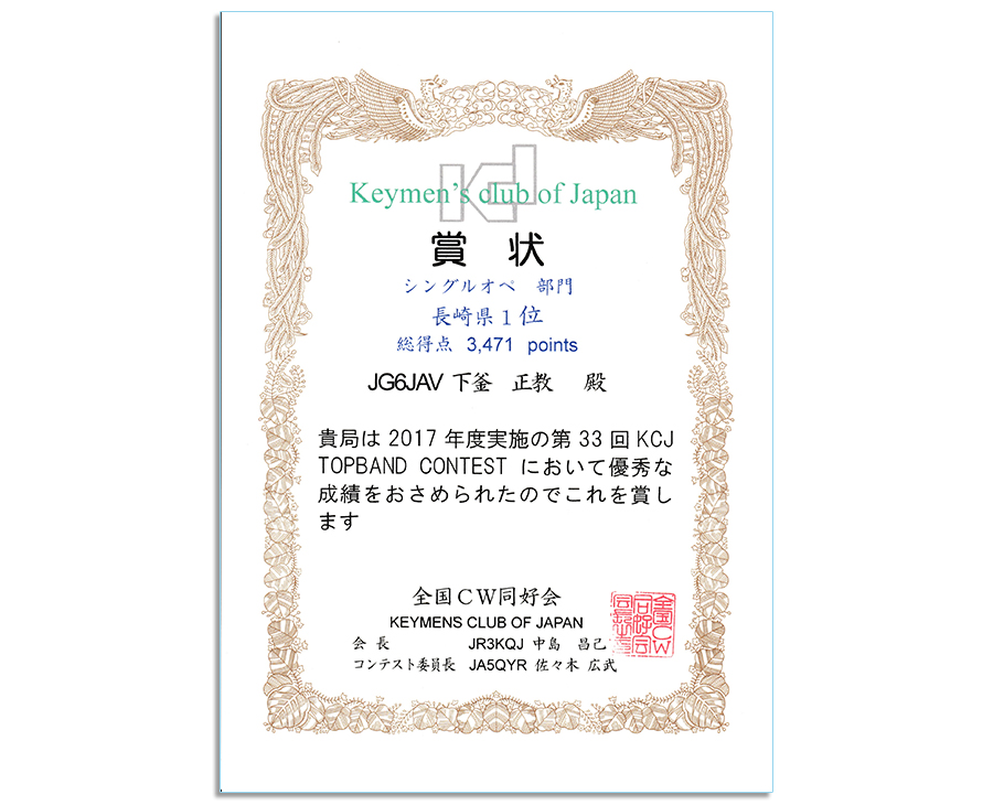 早速賞状を郵送でいただきました。迅速なご手配にびっくりです。QSOいただきました各局ならびにKCJのみなさまありがとうございます。