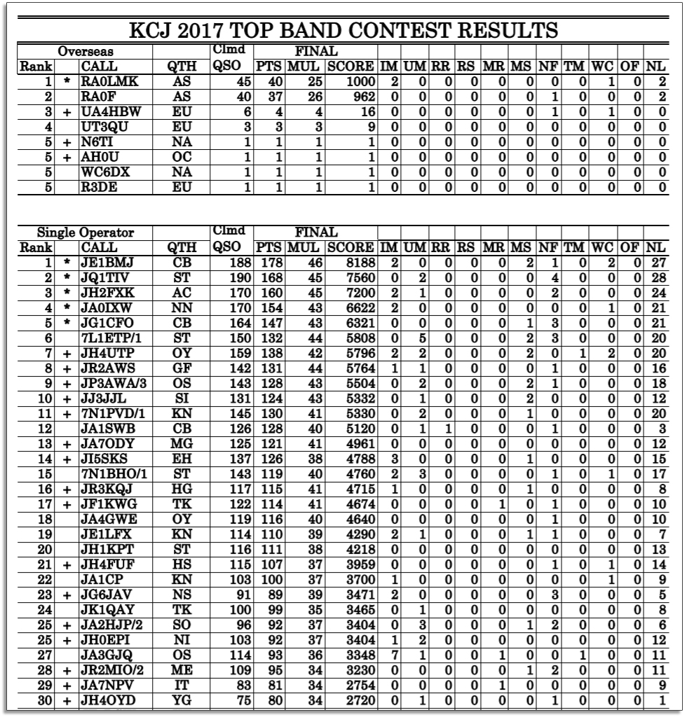 2月11日にKCJ主催で開催されたKCJ 2017 TOP BAND CONTESTの結果が発表されていた。国内参加173局中23位けっこう上位かなとは思うけれどもトップスコアの半分にも満たないスコアです。弊局の設備とか運用場所とか考えるとこれが限界ではないかなと思われます。せめてアンテナをどうにかできる技術でもあればもうすこしなんとかできるかもです。