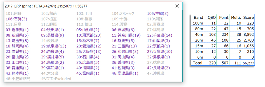本日5月7日12:00から21:00(JST)まできゅうあ~るぴぃ~コミュニティ主催の第8回QRP Sprintコンテストに参加してました。第4回から参加しているので今回で5回目となる。当コンテストは、最大出力が5Wなので力で潰し合うこともないので好きなコンテストの一つです。そのため弱い信号を注意深く傾聴してないといけない。再送要求も再送も多い。想像力も時々必要。QSBやノイズまみれの微弱な信号での交信は、けっこう冷や汗ものです。そういうところが案外変態的に楽しいと思う所以。
