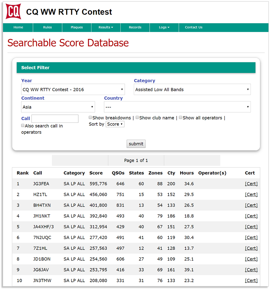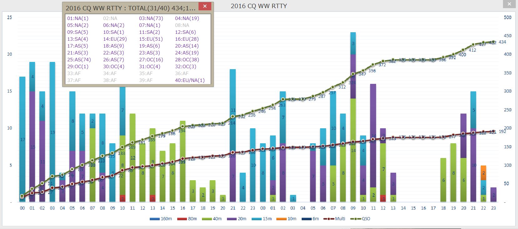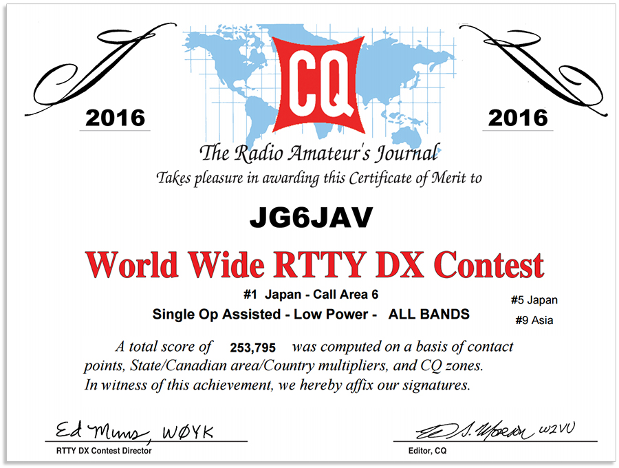 2016年9月24日9:00から26日9:00(JST)に開催されていたCQ WW RTTY Contestの最終結果が発表されていた。RTTYコンテストで唯一参加しているコンテストなのです。理由は明白、コンテストナンバーが固定だからIC-7800のRTTY定型文送信でなんとかなるからです。でもログの記録と連動してないからそれはそれは大忙しのオペレーションなのです。WPXみたいなシリアルナンバー送信はとても無理です。ということで弊局JG6JAVがエントリーした部門 Single OP. Assisted Low Power All Bands での結果は、九州エリア1位、日本5位、アジア9位、世界55位でした。総エントリーが400。48時間中39時間運用したことになっていますが実際には、ブツ切りで寝ているので短いはず。ともかく効率はあまりよろしくありませんね。弱小なのでマルチプライヤーを積み上げることを重点的にやっていました。この賞状も参加してログを送り失格扱いにならない限り全ての局がPDFでダウンロードできます。Wold Wide DXコンテストで賞状があるというだけでも何かのハッタリにはなりそうですね。