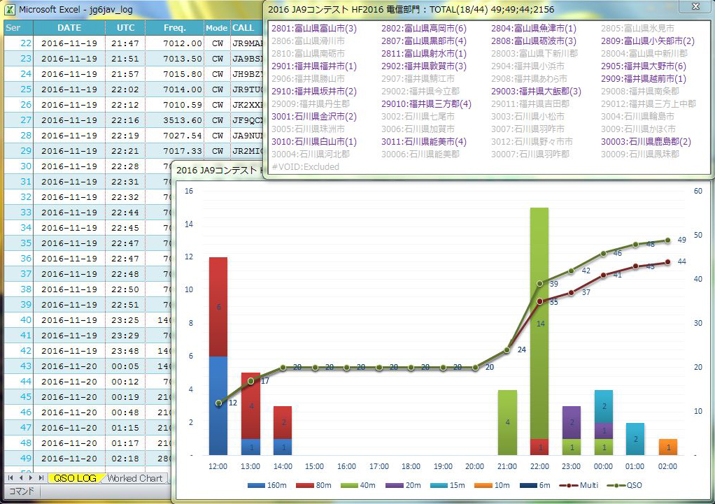昨夜21時から本日12時までのJARL北陸地方本部主催の標記のコンテストに参加してました。だいたいグラフの通りの状況で昨夜24時前までに1.9MHzと3.5MHzで聞こえているJA9の局と交信して続きは、翌朝ということでさっさと寝て5時半くらい起きてワッチを始めて1.9MHzと3.5MHzで聞こえていたのは昨夜交信済みの局ばかり。6時半くらいから7MHzで参加しているJA9の局が聞こえ始めて8時くらいまでにほぼ聞こえているほぼすべてのJA9局と交信したあと14MHz以上のハイバンドでJA9局を探していました。ハイバンドになると伝播状況が極端に悪くてこんな感じの交信実績となりました。カスカスで聞こえている信号がQSBで浮いて聞こえるのを待ってポツンポツンと交信実績を積み上げるしかありませんでした。