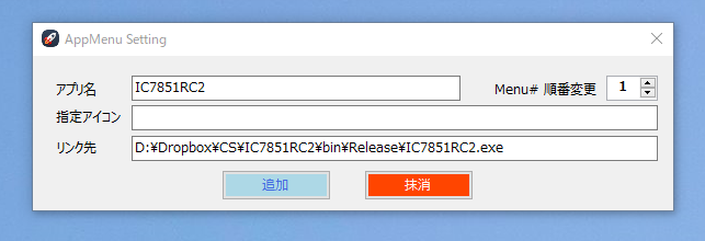 表示中のAppMenu Setting ダイアログに追加したいアプリケーションのアイコンまたは実行ファイルをドラッグしてこの上にドロップして下さい。ボタンが追加されます。ボタンの表示文言を変更するにはダイアログのアプリ名のテキストボックスの内容を書き換えます。