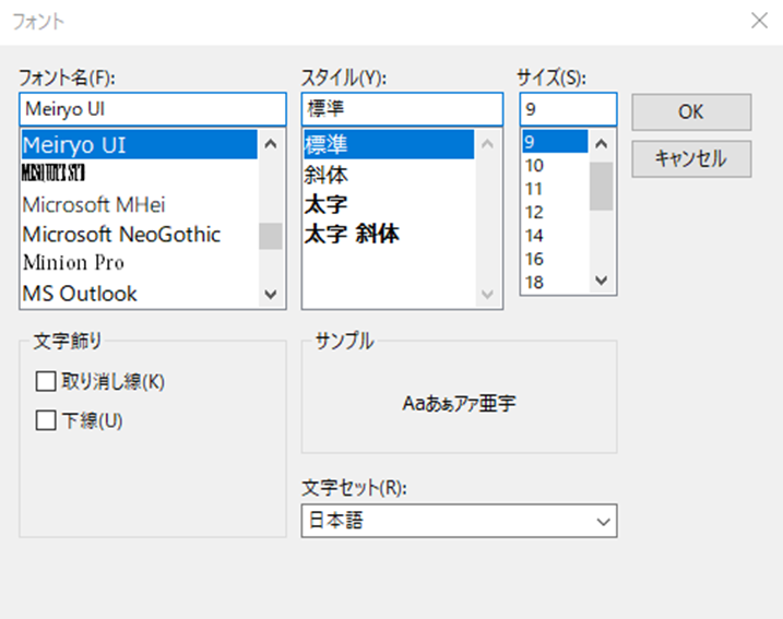 フォントダイアログが表示されます。フォントや大きさを変更できます。ただしスタイルは[標準]でその他は無意味です。