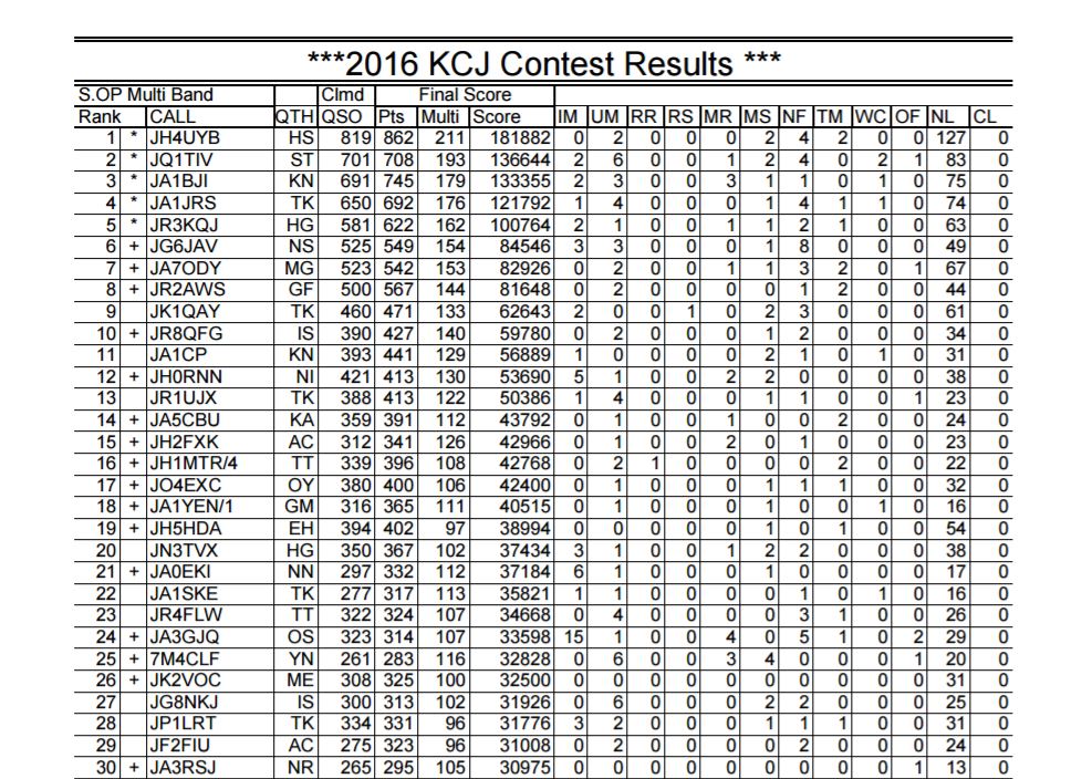 2016年8月27日に開催された全国CW同好会(KCJ)主催のKCJコンテスの結果が発表された。