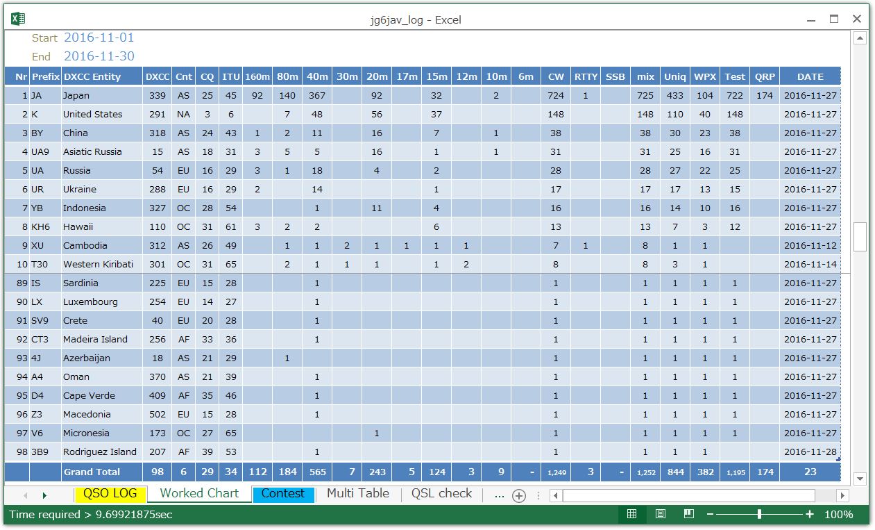 11月は、全QSO1,252中1,195がコンテストQSOということになっています。五つのコンテストに参加したので当然と言えば当然の内容です。