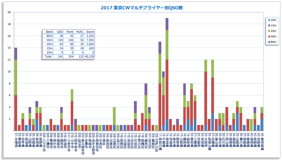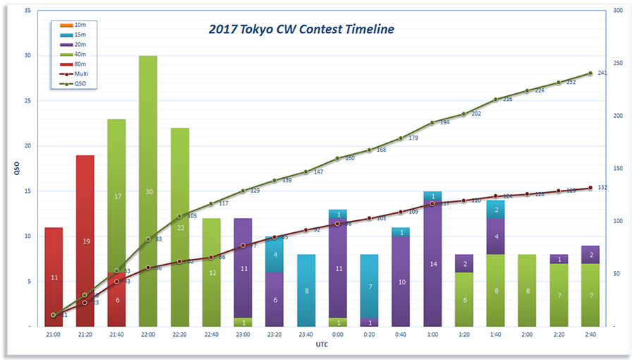 10月22日6:00から12:00(JST)までJARL東京都支部主催の東京CWコンテストに参加していた。衆議院議員総選挙投票日でもあるけれども超大型台風になってしまった台風LAN(#21)も南洋から日本列島へ向かって北上中でもある。SNSをみていると台風来襲に備えてアンテナを退避させるという局もいらっしゃる。少しばかり参加局が少なくなっているかもしれないけれどもともかく参加した。CWコンテストなのでCW部門のみ。弊局JG6JAVはオールバンド部門にエントリーした。運用状況は、以下のチャートの通り。