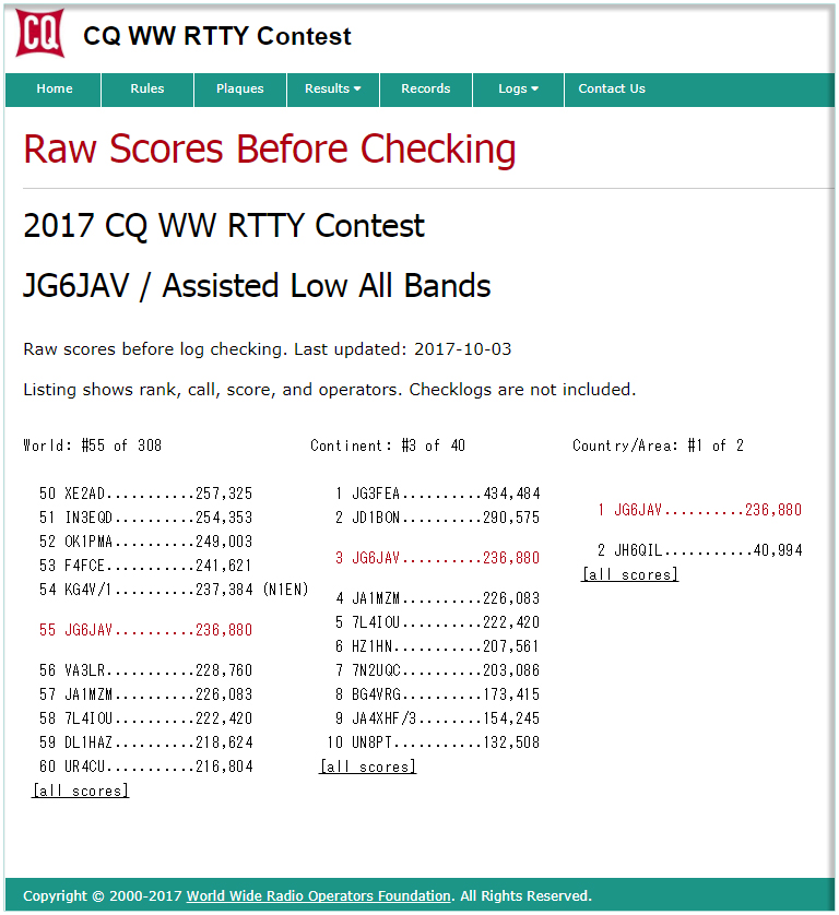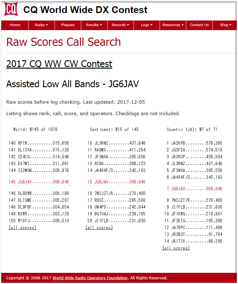 11月下旬に参加していた2017 CQ WW CW DX Contest のRaw Scoreが発表されていた。説明するまでもないいことかもだけれどもRaw Scoreとは、提出したログだけで採点したものでログの照合とか内容の検証がなされてない状態のものだ。