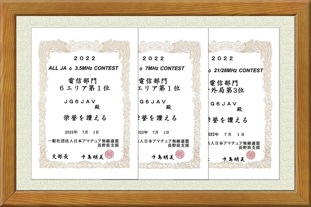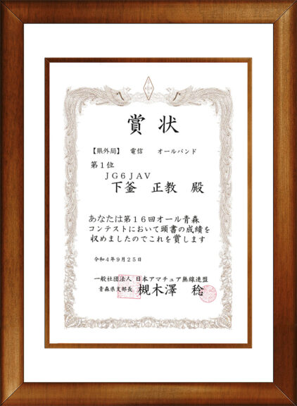 第16回オール青森コンテストの賞状 2022.10.062022.10.07 2022年9月に結果が発表されていた第16回オール青森コンテストの賞状を拝領いたしました。当コンテスト中交信下さいました各局いつもありがとうございます。 副賞もいただきました。ありがとうございます。