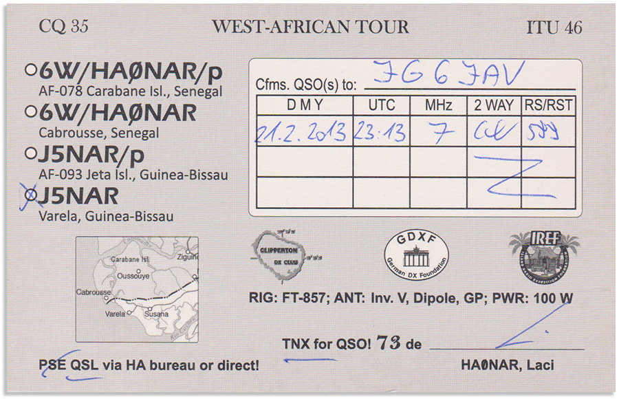 J5NARは、ハンガリーデブレツェン大学植物防疫学ラッソー教授(HAØNAR)が2013年ギニアビサウ共和国で運用していた時に交信できたアマチュア無線局です。実はすっかり忘れていたのですが弊局にとってそんなに簡単に交信できるとこころではないので今更と思いながらも2017年11月にClublogからOQRSしていたものです。