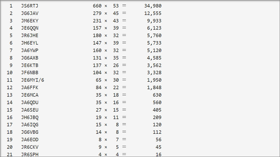 2022年 第52回6m AND DOWN コンテストの結果 2022.10.11 2022年7月に参加していた JARL 52回6m AND DOWN コンテストの結果が発表された。弊局JG6JAVは、電信部門シングルオペ50MHzバンドに九州全21局中2位だった。 URL https://www.jarl.org/Japanese/1_Tanoshimo/1-1_Contest/6m/2022/entry.html#C50 やっぱり沖縄局は凄いなあ。まったくもって敵わない。