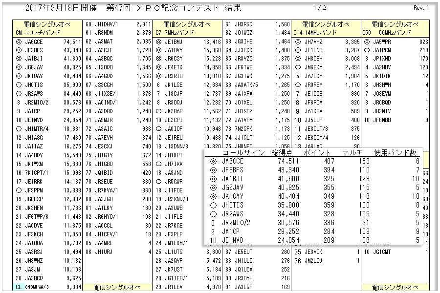 2017年9月18日に開催された第47回XPO記念コンテストの結果が発表されてました。弊局はJG6JAVは電信シングルオペマルチバンド部門に於いて全86局中4位入賞でした。交信していただきました各局いつもありがとうございます。