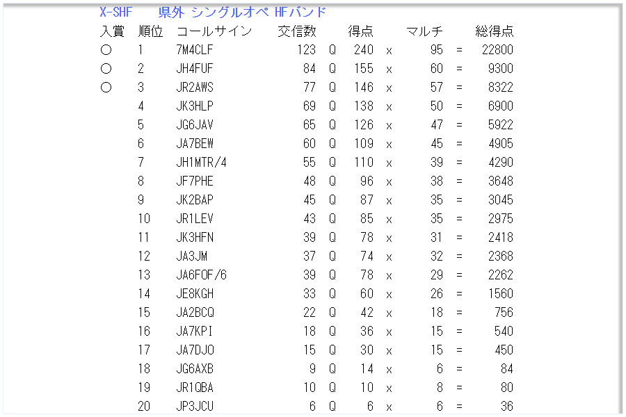 今年1月8日に開催されていた第36回オール埼玉コンテストの結果が発表された。弊局JG6JAVは、X-SHF:県外シングルオペHFバンド部門で全21局中5位でした。入賞ではありません。やはりハイバントの伝播状態が悪いとどうにもならないようです。