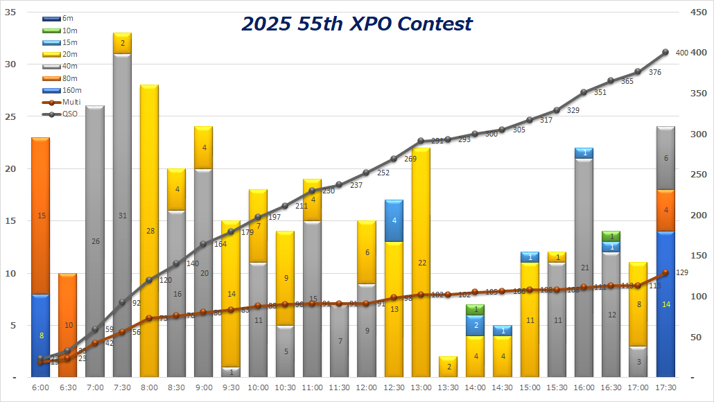 2023年 第17回福岡コンテスト 2023.10.012023.10.11 (JST)2023年9月30日(土)21:00から翌10月1日(日)15:00まで第17回福岡コンテストに参加していた。コンテスト中の運用状況は以下のチャートの通り。 バンド別交信数推移 長崎と福岡は、HFハイバンドで交信するのはけっこう厳しい。けれども今年は、ギリギリの交信ではあったけれども昨年よりも多く交信することができた。