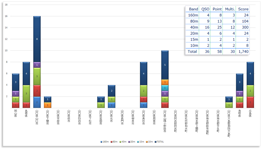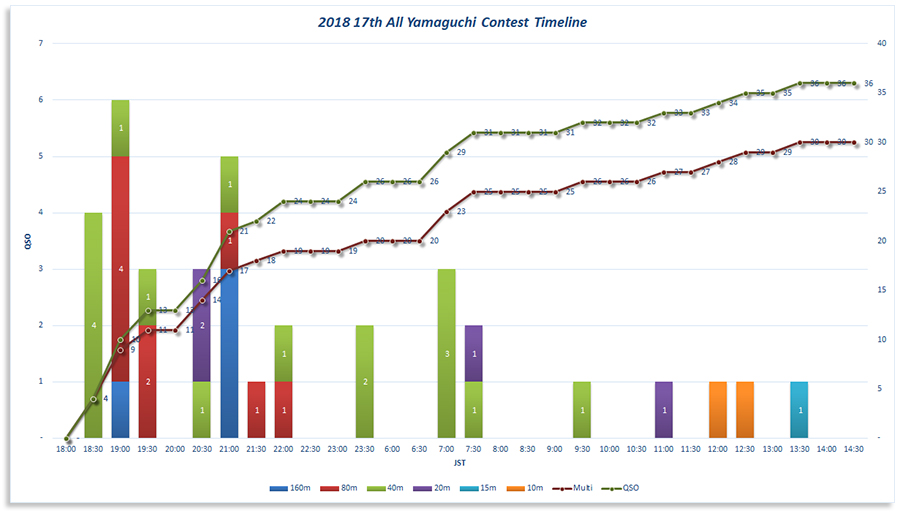 5月12日18:00JSTから13日21日15:00JSTまでJAR山口県支部主催の第17回オール山口コンテストに参加していた。弊局JG6JAVはこれに電信HF部門に臨んだ。交信対象は、中国地方(JA4)で運用している全ての局が対象となっている。山口県内局だけ得点が2点で他県は1点だ。運用状況は以下のチャートの通り。