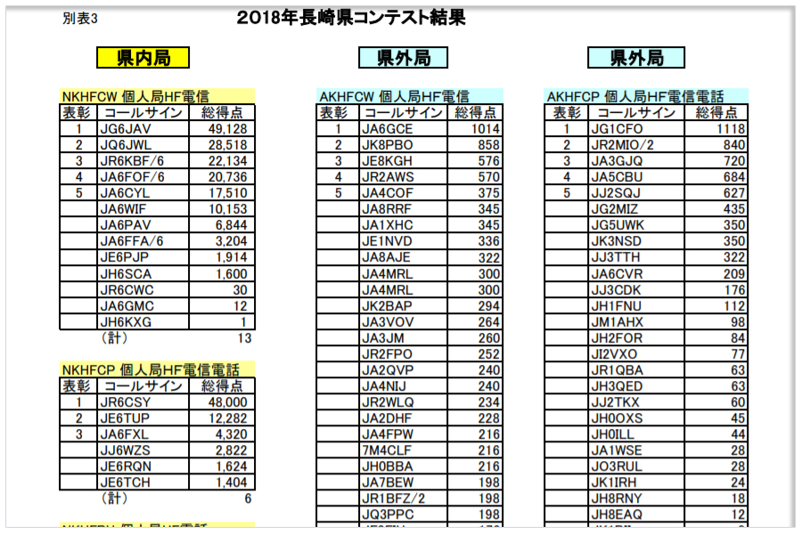 今年4月に開催された2018年長崎県コンテストの結果が発表された。弊局JG6JAVは、県内局個人局HF電信の部門全13局中1位という結果になりました。交信していただきました各局ありがとうございます。