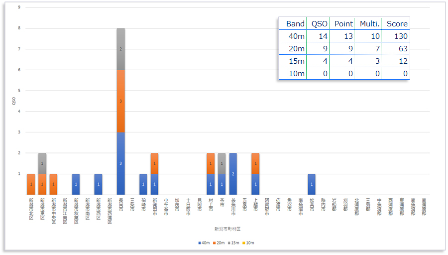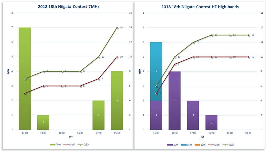 5月20日13:00JSTから19:00JSTまでJARL新潟県支部主催の第18回新潟コンテストに参加していた。直前の12:00までオール群馬コンテストに参加していた。7MHz部門とHFハイバンド部門それぞれ3時間。どういうわけが7MHzが先でHFハイバンドがが後になっている。電波伝播上は逆の順序がいいと思うのだが新潟では現行順序の方がいいのだろうか。単に私の思い込みだろうか。運用状況は、以下のチャートの通り。弊局JG6JAVは電信部門にエントリー。p>