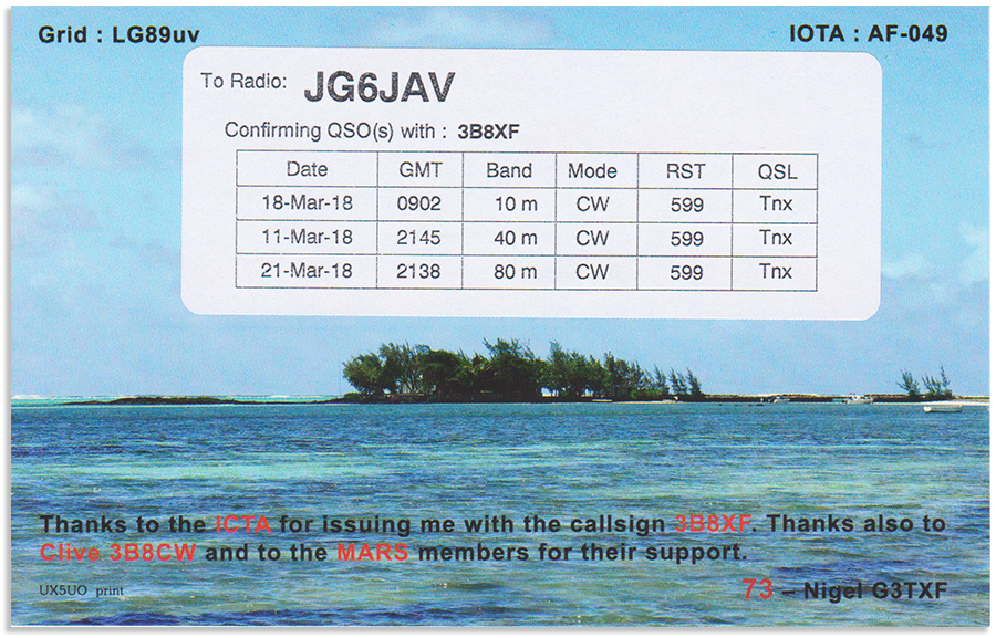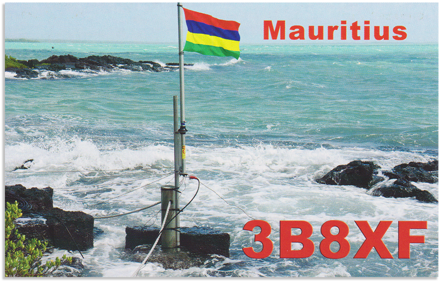 3B8XF QSL card arrived 2018.05.312021.04.24 3B8XFは、アフリカ南東部のマダガスカル島沖の島国モーリシャス共和国からイギリスのG3TXFが運用していたアマチュア局です。ClublogよりOQRSしていものです。黒船を率いたペリーがアメリカ東海岸から日本へ向かう途中休養のために立ち寄った島でもある。旧日本海軍に敗れたバルチック艦隊の集合地だったとか。そのころすでに当地には商店を開いていた日本人がいて電報でその動きが日本に報されていたとか。そんな島国からです。 3.5MHz(80m)での初アフリカ交信局なのでありました。