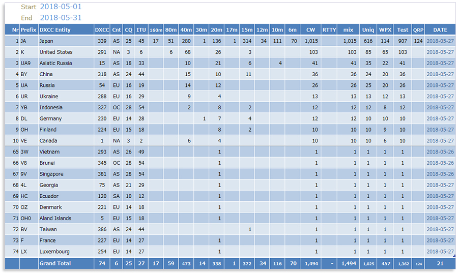 5月は、予定していた9種のコンテスト全てに参加することができたのでこのような交信数となった。どのコンテストも伝播状況不良であまりQSO数は伸びなかった。全体の約半数がCQ WW WPXだ。DXは、モザンビークにフォーカスして追っかけをやっていた。今月は、JARL主催のALL ASIAN DX Contestがあるのだけれども状況が良くなるような気配を感じられない。すこしくらい良くなるとよいのだが。そんな伝播状況不良ということもあってか新デジタルモードFT8の運用が盛んに行われているいるようだ。RTTYをあまり面白いと感じないと同じで弊局は、まだやる気無しである。