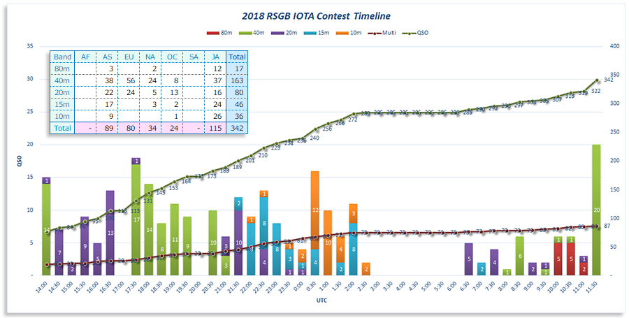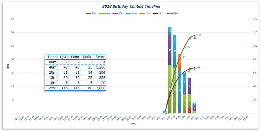 7月28日12:00UTC(21:00JST)から翌29日12:00UTCまで2018 RSGB IOTA CONTESTに参加した。途中3時間ほど三重コンテスターズクラブ主催の2018BIRTHDAY CONTESTにも参加した。台風#12(ジョンダリ)が東海経由で九州に向かうという逆走コースで上陸していた。一部の地域では、けっこうな被害に遭ったようだ。長崎は、いたって平穏で29日夕方から少しばかり雨が降った程度であった。ともかくそんな中コンテスト参加である。いつもと変わらず室内で静かにコンテスト運用に勤しんでいた。運用状況は、以下のチャートの通り。双方時間を揃えてみた。