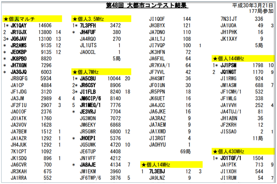 本年3月に開催された第48回大都市コンテストの結果が発表された。弊局JG6JAVは、個人マルチパンド部門で全47局中3位だった。数年ぶり2度目の参加で初入賞となった。交信していただきました各局ありがとうございます。