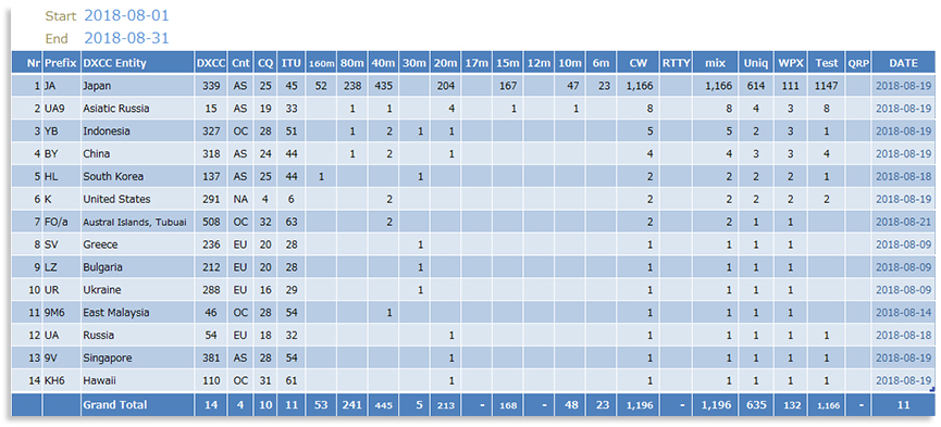 弊局JG6JAVの2018年8月の運用状況は、以下のチャートの通り。8月に参加したコンテストは、少なかったけれどもJARL主催のフィールドデーコンテストと全国CW同好会主催のKCJだけで1000QSO超えとなった。DXの方は、まったくもってダメダメでハイバンドは当たり前のようになにも聞こえない日ばかり。40m(7MHz)は早朝からOTHレーダーノイズでまったくもってどうにもならない状況が続いている。9月は少しくらいよくなってくれるのだろうか。