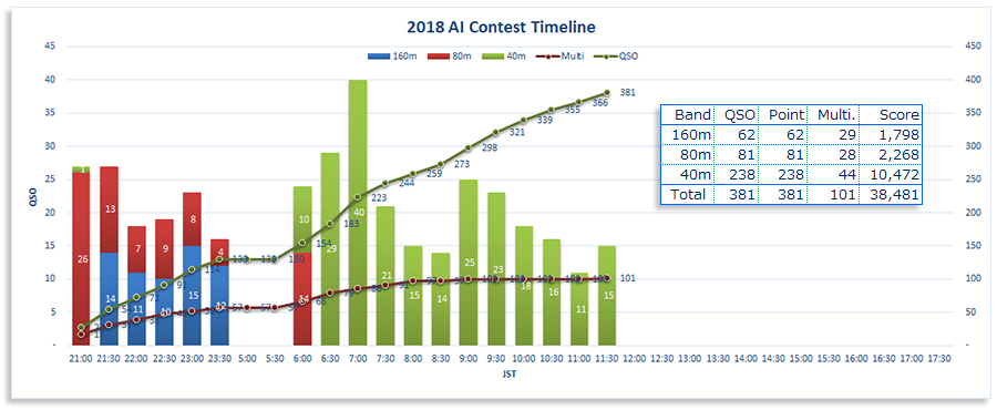 ハイバンドは、ほとんど聞こえなかったので今年も電信HFローバンド部門に参加した。22日は、80m(3.5MHz)と160m(7MHz)だけに専念して23日は40m(7MHz)を重点的に運用した。QSO数マルチプライヤー共に前年比増で終えることが出来た。