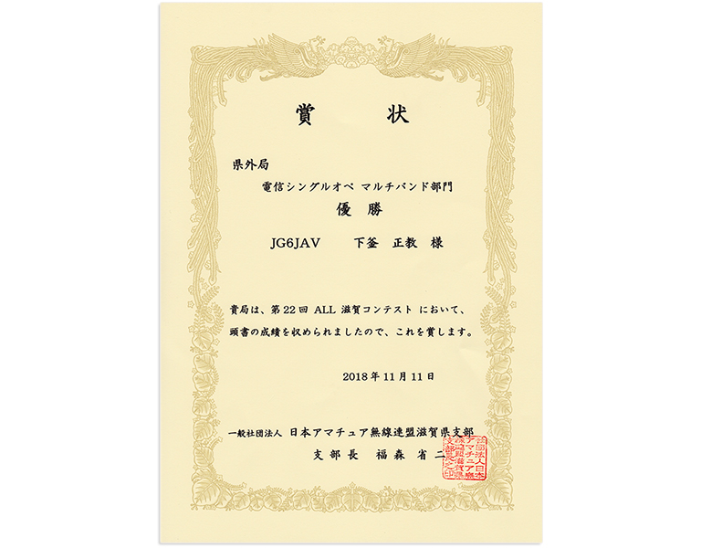 第22回ALL滋賀コンテストの賞状を拝領いたしました。 2018.11.172021.07.22 10月に結果が発表された第22回ALL滋賀コンテストの賞状を拝領いたしました。当時交信していただきました各局ありがとうございます。主催のJARL滋賀県支部のみなさんありがとうございます。