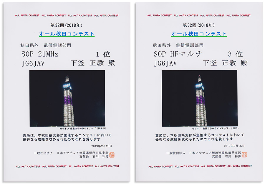 昨年11月に結果が発表されていた第32回オール秋田コンテストの賞状を拝領いたしました。当時交信していただきました秋田県内各局みなさまありがとうございます。