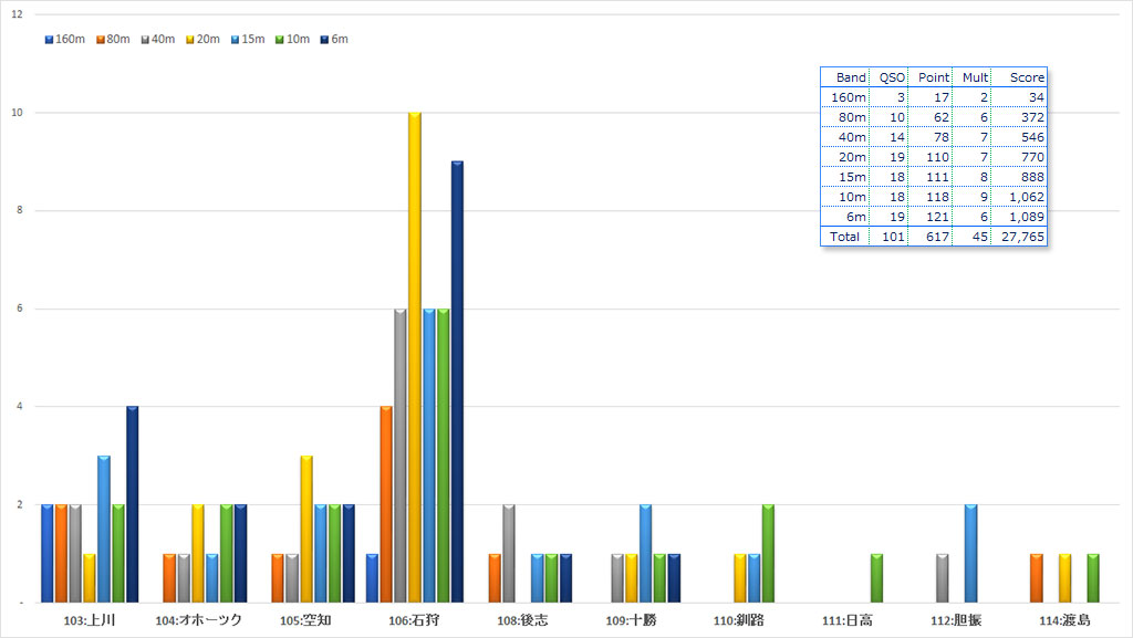今年は6m(50MHz)での交信が少なく前年比減のスコアで終わった。