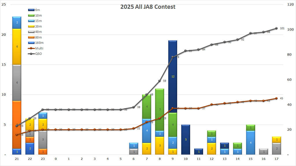 開始前から6m(50MHz)の国内パス良好で6mからRUNしていた。しかし、期待していた程応答がなかった。HFハイバンドのJA1エリア(関東地方)と伝播状態良好で前年比増のスコアだった。しかしHFローバンドはきびしかった。
