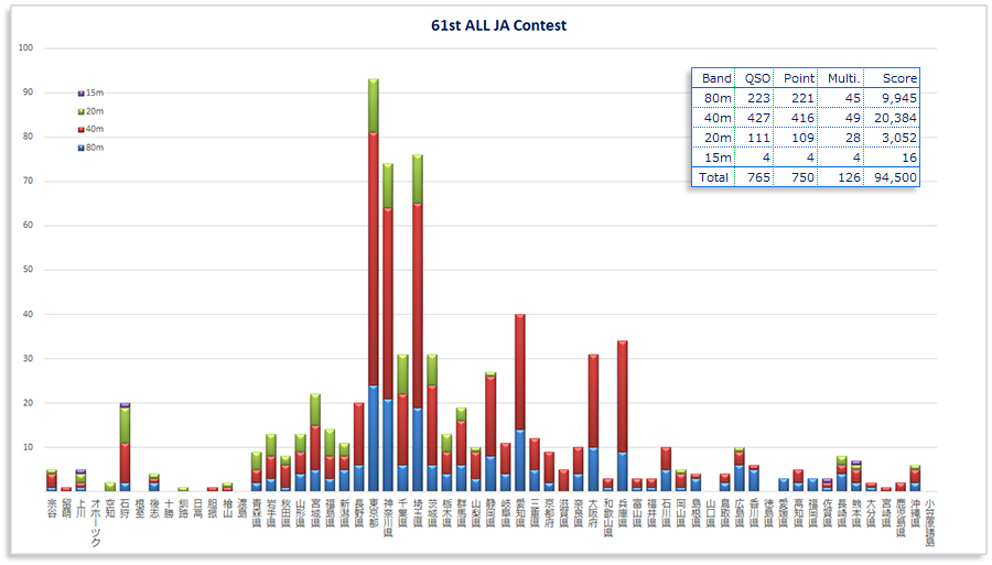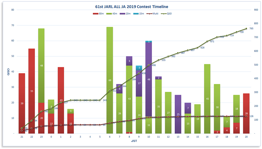 2019年4月27日21時00分から翌28日21:00(JST)までJARL主催の第61回 ALL JAコンテストにCAM(CW All bands Middle power)部門で参加した。コンテスト中の運用状況は、以下のチャートの通り。