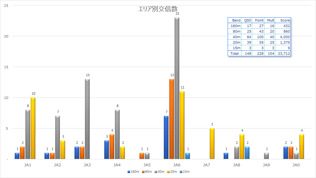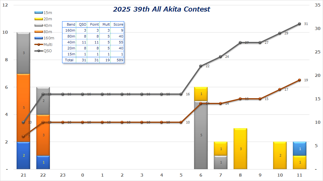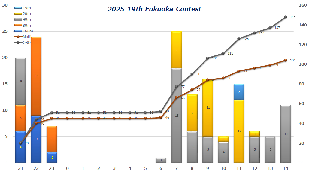 福岡コンテストと時間帯が丸被りで埋もれてしまっていた感があった。さぞや秋田県内局は、難儀だったことだろう。秋田県内局のコンテストナンバーが英字2文字でJCC#ではなかったので福岡コンテストと併用できないのが痛かった。その上電信部門がないので個人的には面白くない。