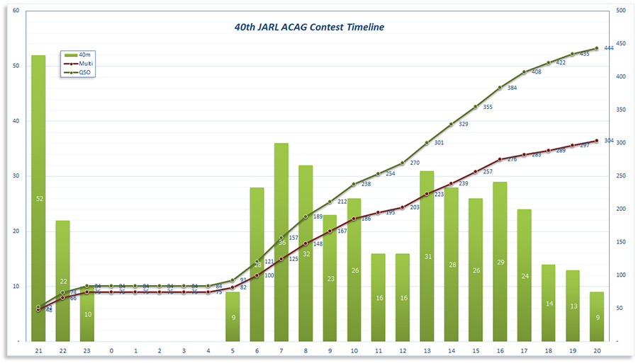 2019年10月12日21:00から翌13日21:00(JST)までJARL主催の第40回全市全郡コンテストが開催されていた。これに弊局JG6JAVは、電信シングルオペ7MHzバンド100W以下(C7M)で参加した。コンテスト中の運用状況は以下のチャートの通りである。