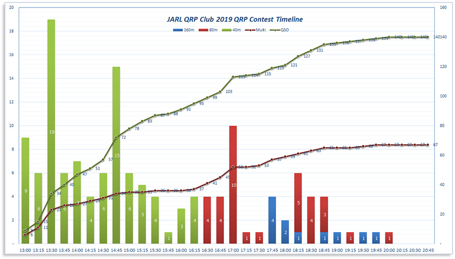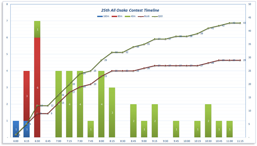 毎年文化の日は、JARL QRP Club主催のQRPコンテストだけれども11月第1日曜日でもありJARL大阪府支部主催のオール大阪コンテストと日程が重なってしまった。そのためかQRPコンテストは、時間調整されて重ならないように午前中の時間かなくなっていた。それぞれのコンテスト運用中の状況は以下のチャートの通りである。