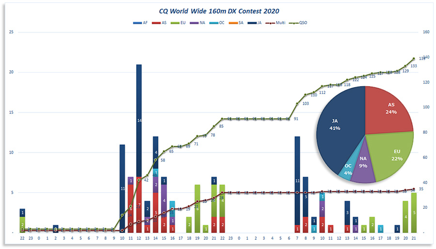 CQ World Wide 160m DX Contest 2020 2020.01.272021.05.02 2020年1月25日07:00時から27日07:00時(JST)まで48時間CQ Wolrd Wide DX Contestに参加していた。160m(1.8MHz)バンドは、日が昇っていない時間帯くらいにしかよく聞こえないので実際のコンテスト運用時間はそんなに長くない。コンテスト中の状況は以下のチャートの通り。 Low Power Assisted でがんばってはいたけれどもこちらから呼んでも呼んでも気付いてくれない局多数で心折れそうではなくボキボキ折れまくっていた。