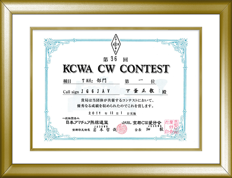 第36回KCWAコンテストの賞状と盾。 2020.03.11 2020年2月に結果が発表されていた第36回KCWAコンテストの賞状と盾を拝領いたしました。当該コンテスト中に交信いただきました各局ありがとうございます。 盾