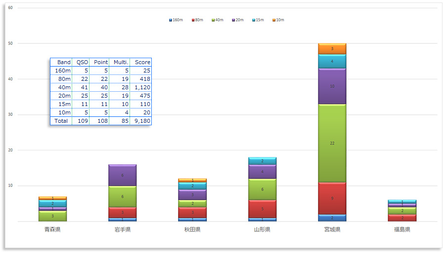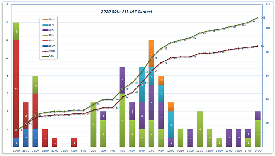 4月18日21:00より翌19日15:00(JST)までJARL東北地方本部主催の第69回オール東北コンテストに参加していた。今、全世界的にCOVID-19(新型コロナウイルス肺炎)感染防止のためいろいろなイベントが中止になってしまっているけれどもアマチュア無線のコンテストまでは中止になっていない。コンテストの運用状況は、以下のチャートの通り。
