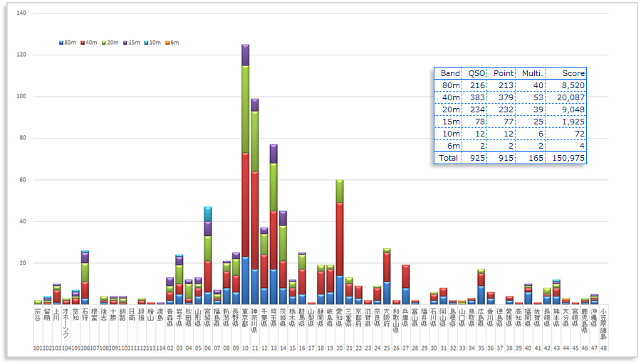 もしかして全マルチプライヤー埋まるかもと思ったけど、都道府県部別では、福井県と徳島県の局と交信できずに空欄のままとなった。残念。驚いたのは、他県からの移動局でない佐賀県内局と交信できたことだ。いったいぜんたいいつからぶりの出来事だったのだろうか。