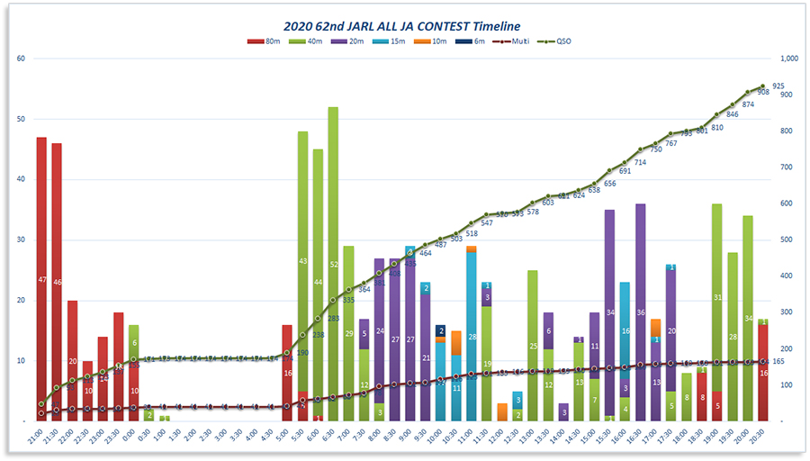 4月25日21:00から翌26日21:00(JST)までJARL主催の第62回ALL JAコンテストに参加していた。STAYHOMEで巣籠もりな遊びなのでCOVID-19(新型コロナウィルス)の影響はないだろうと思っていたらなんと、マルチオペ種目が削除されていた。さらに移動運用は、自粛するようにとまで規約に書いてあった。ともかく全世界的に色々なイベントが中止になってしまっている中アマチュア無線のコンテストは、対象外だ。ともかくシングルオペで移動できない局である弊局JG6JAVにはまったく影響なしだ。今回のコンテスト中の運用状況は以下のチャートの通りである。参加部門は、電信オールバンド出力100W以下。
