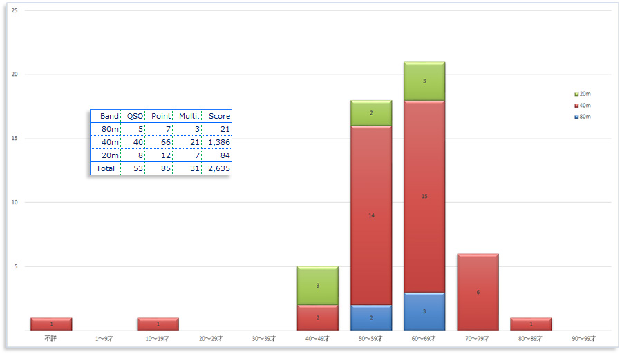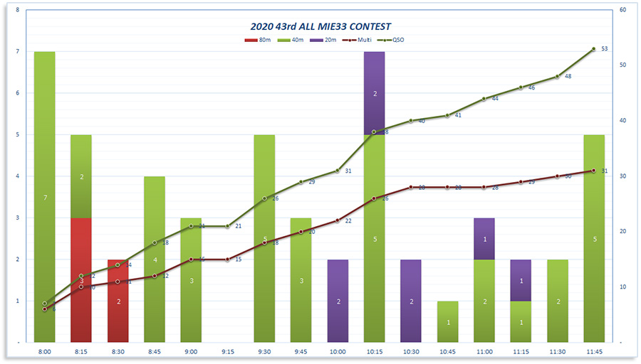 5月5日8:00から12:00(JST)までJARL三重県支部主催の第43回オール三重33コンテストに参加していた。コンテスト参加中の運用状況は以下のチャートの通りである。