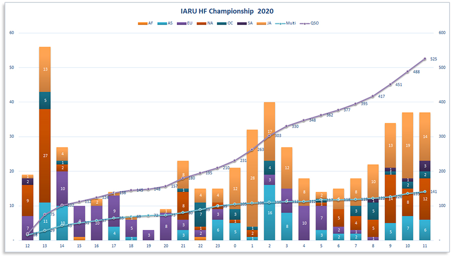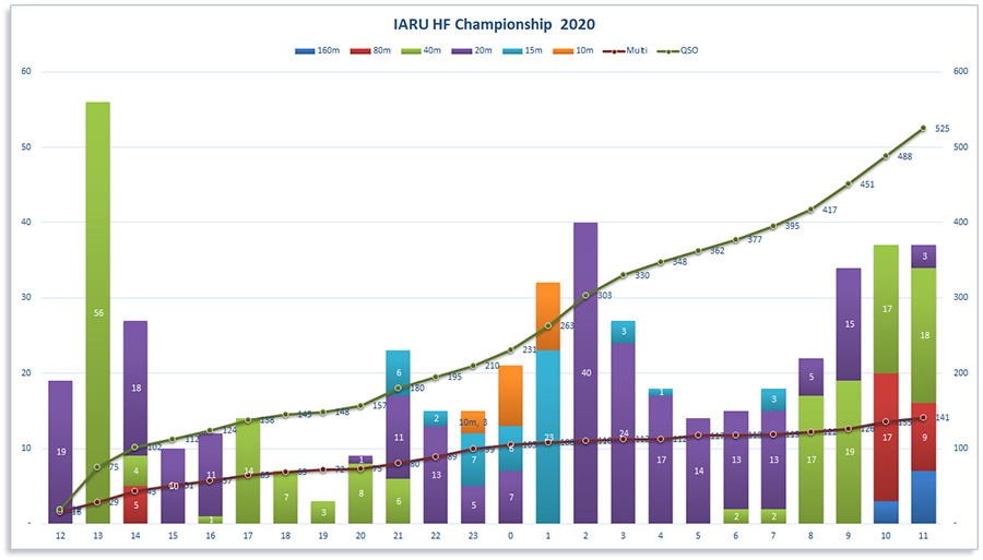 2020年7月11日12:00から翌12日12:00UTCまで2020 IARU HF WORLD CHAMPIONSHIPに参加していた。コンテスト中の運用状況は以下のチャートの通りである。