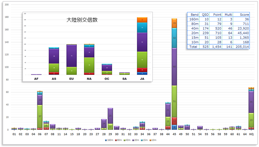 このコンテストで500QSO超え(国内35%弱)は初めてのことだと思う。昨年よりは良いのだけれどもスコアは、そんなに高くない。アンテナが変わったことを考慮しても昨年よりは伝播状態はよかったのではないだろうか。そろそろSSNどん底時期も終わりであとは上がるだけではないかと期待している。