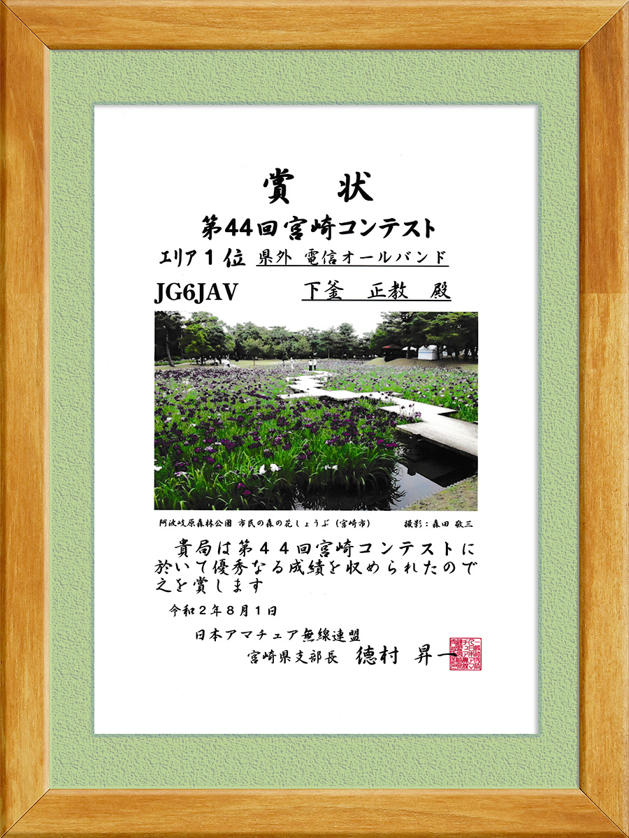 前日結果が発表されていた第44回宮崎コンテストの賞状をJARL宮崎県支部より拝領いたしました。7位でしたが6エリア1位ということらしい。ありがとうございます。