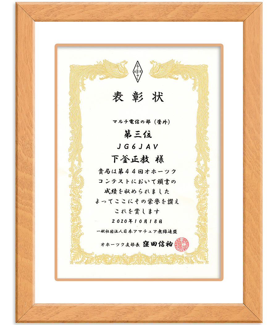 当月結果が発表されていた第44回オホーツクコンテストの賞状を拝領いたしました。サマリーログ未着だったが結果内容が訂正されたようだ。交信していただきましたオホーツク各局ありがとうございます。