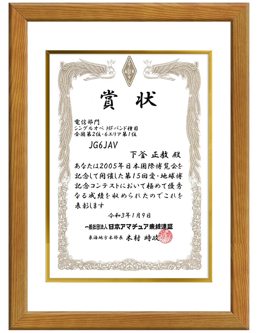 第15回愛・地球博記念コンテストの賞状 2021.03.022021.03.24 2021年1月に結果が発表されていた第15回愛・地球博記念コンテストの賞状を拝領いたしました。当コンテスト中交信していただきました各局いつもありがとうございます。