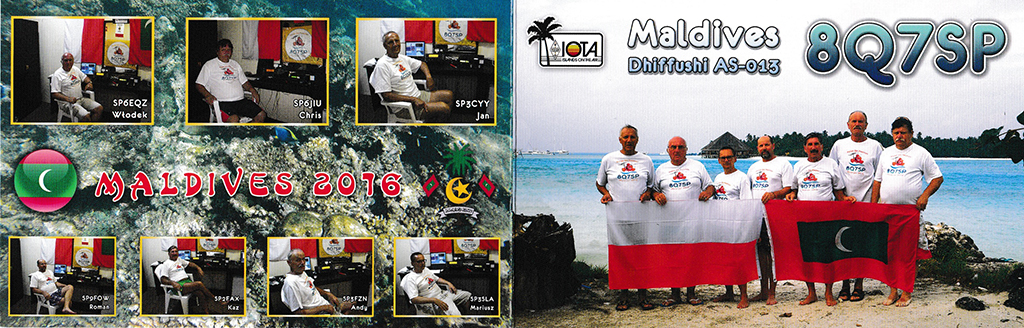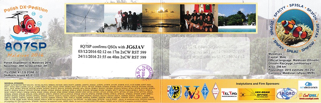 このQSLカードは、インド洋の環礁や小さな島々で成るモルディブ共和国でポーランドのアマチュア無線局グルーブが運用していた8Q7SPからのものです。ClublogからOQRSして一ヶ月弱で届きました。何故かドイツからの発送。ドイツは郵便料金が安いらしい。