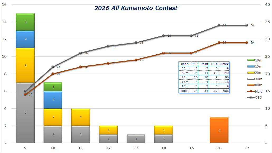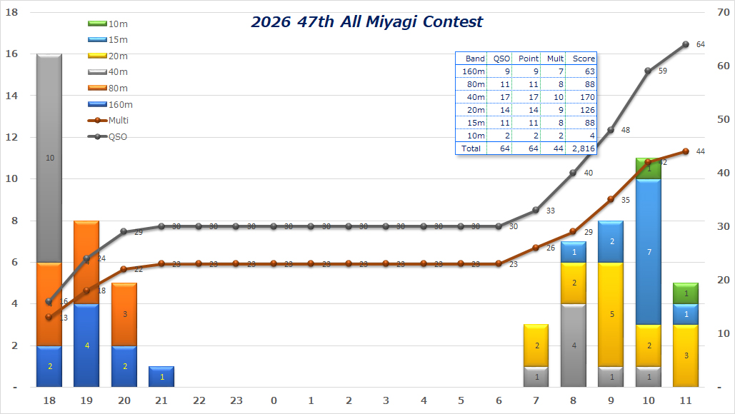 (JST)2026年1月17日(土)18:00から翌18日(日)11:59までJARL宮城県支部主催第47回オール宮城県コンテスに参加していた。コンテスト中の運用状況は以下のチャートの通り。 時系列交信数推移 17日夜は、ローバンドのみの運用。 早々に宮城...