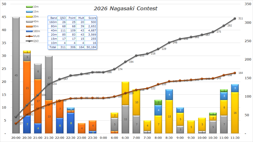 J'ai participé au concours. 2026 長崎県、和歌山コンテスト 2026年長崎県コンテスト (JST)2026年4月4日(土)20:00から翌5日(日)12:00までJARL長崎県支部主催の2026年長崎県コンテストに参加していた。コンテスト中の運用状況は以下のチャートの通り。 交信数時系列推移 開始から40m(7MH... 2026.04.10 J'ai participé au concours.