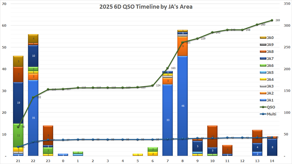第55回6m AND DOWN コンテスト (JST)2025年7月6日(土)21:00から翌7日(日)15:00まで。 時系列交信数推移 今年も昨年と似たような感じに山二つ。少しだけ前年比増。せっかく応答していただたのに尻切れトンボになってしまった局がち...